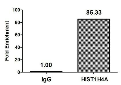 Chromatin Immunoprecipitation Hela (4*106, treated with 30mM sodium crotonylate for 4h) were treated with Micrococcal Nuclease, sonicated, and immunoprecipitated with 5µg anti-HIST1H4A (CSB-PA010429OA08crHU) or a control normal rabbit IgG. The resulting ChIP DNA was quantified using real-time PCR with primers against the β-Globin promoter.