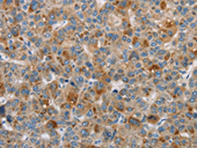 The image on the left is immunohistochemistry of paraffin-embedded Human liver cancer tissue using CSB-PA020742(DBH Antibody) at dilution 1/70, on the right is treated with fusion protein. (Original magnification: ×200)