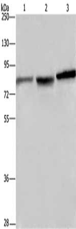 Gel: 8%SDS-PAGE, Lysate: 40 μg, Lane 1-3: Mouse brain tissue, A172 cells, Hela cells, Primary antibody: CSB-PA020742(DBH Antibody) at dilution 1/200, Secondary antibody: Goat anti rabbit IgG at 1/8000 dilution, Exposure time: 10 seconds