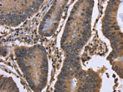 The image on the left is immunohistochemistry of paraffin-embedded Human colon cancer tissue using CSB-PA086956(DCP1A Antibody) at dilution 1/50, on the right is treated with fusion protein. (Original magnification: ×200)