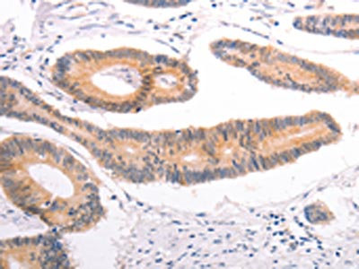 The image on the left is immunohistochemistry of paraffin-embedded Human colon cancer tissue using CSB-PA210688(DCT Antibody) at dilution 1/25, on the right is treated with fusion protein. (Original magnification: ×200)