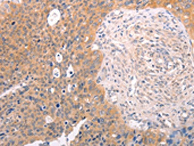 The image on the left is immunohistochemistry of paraffin-embedded Human cervical cancer tissue using CSB-PA210688(DCT Antibody) at dilution 1/25, on the right is treated with fusion protein. (Original magnification: ×200)