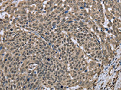The image on the left is immunohistochemistry of paraffin-embedded Human cervical cancer tissue using CSB-PA561781(DCTN4 Antibody) at dilution 1/30, on the right is treated with fusion protein. (Original magnification: ×200)