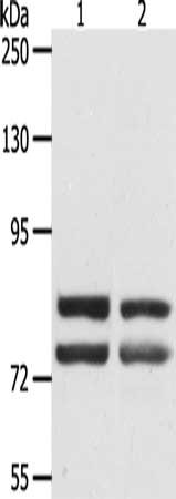 Gel: 8%SDS-PAGE, Lysate: 40 μg, Lane 1-2: SKOV3 cells, hela cells, Primary antibody: CSB-PA178606(DDX4 Antibody) at dilution 1/300, Secondary antibody: Goat anti rabbit IgG at 1/8000 dilution, Exposure time: 45 seconds