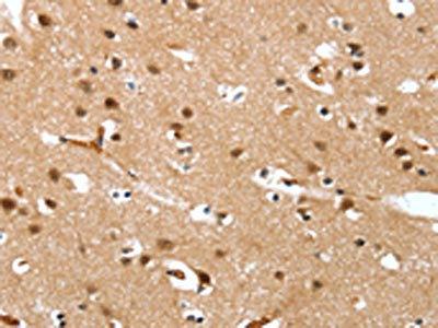The image on the left is immunohistochemistry of paraffin-embedded Human brain tissue using CSB-PA968280(DEFA4 Antibody) at dilution 1/20, on the right is treated with synthetic peptide. (Original magnification: ×200)