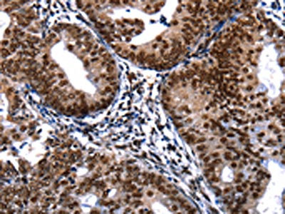 The image on the left is immunohistochemistry of paraffin-embedded Human cervical cancer tissue using CSB-PA783338(DFFA Antibody) at dilution 1/20, on the right is treated with fusion protein. (Original magnification: ×200)