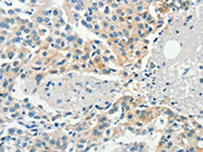 The image on the left is immunohistochemistry of paraffin-embedded Human liver cancer tissue using CSB-PA962705(DGKB Antibody) at dilution 1/60, on the right is treated with synthetic peptide. (Original magnification: ×200)