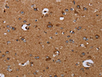 The image on the left is immunohistochemistry of paraffin-embedded Human brain tissue using CSB-PA211015(DISC1 Antibody) at dilution 1/30, on the right is treated with synthetic peptide. (Original magnification: ×200)