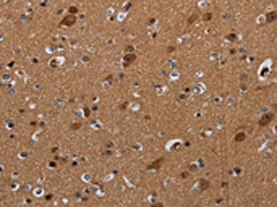 The image on the left is immunohistochemistry of paraffin-embedded Human brain tissue using CSB-PA580837(DISC1 Antibody) at dilution 1/20, on the right is treated with synthetic peptide. (Original magnification: ×200)