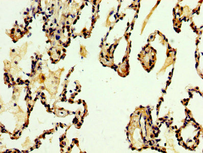 IHC image of CSB-PA08279A0Rb diluted at 1:500 and staining in paraffin-embedded human lung tissue performed on a Leica BondTM system. After dewaxing and hydration, antigen retrieval was mediated by high pressure in a citrate buffer (pH 6.0). Section was blocked with 10% normal goat serum 30min at RT. Then primary antibody (1% BSA) was incubated at 4°C overnight. The primary is detected by a biotinylated secondary antibody and visualized using an HRP conjugated SP system.