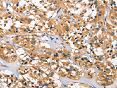The image on the left is immunohistochemistry of paraffin-embedded Human gastric cancer tissue using CSB-PA274333(DKK3 Antibody) at dilution 1/30, on the right is treated with fusion protein. (Original magnification: ×200)