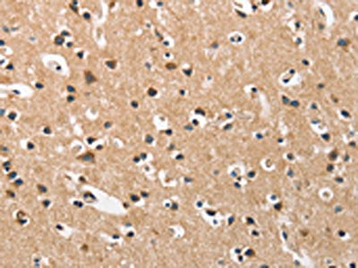 The image on the left is immunohistochemistry of paraffin-embedded Human brain tissue using CSB-PA037884(DKK3 Antibody) at dilution 1/50, on the right is treated with fusion protein. (Original magnification: ×200)