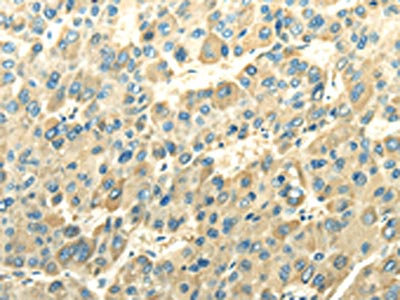 The image on the left is immunohistochemistry of paraffin-embedded Human liver cancer tissue using CSB-PA445587(DLAT Antibody) at dilution 1/30, on the right is treated with fusion protein. (Original magnification: ×200)