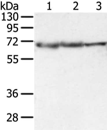 Gel: 8%SDS-PAGE, Lysate: 40 μg, Lane 1-3: Lncap, hepg2 and A431 cell, Primary antibody: CSB-PA445587(DLAT Antibody) at dilution 1/400 dilution, Secondary antibody: Goat anti rabbit IgG at 1/8000 dilution, Exposure time: 3 seconds