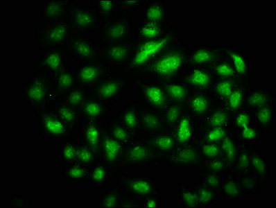 Immunofluorescence staining of Hela cells with CSB-PA873611LA01HU at 1:133, counter-stained with DAPI. The cells were fixed in 4% formaldehyde, permeabilized using 0.2% Triton X-100 and blocked in 10% normal Goat Serum. The cells were then incubated with the antibody overnight at 4°C. The secondary antibody was Alexa Fluor 488-congugated AffiniPure Goat Anti-Rabbit IgG(H+L).