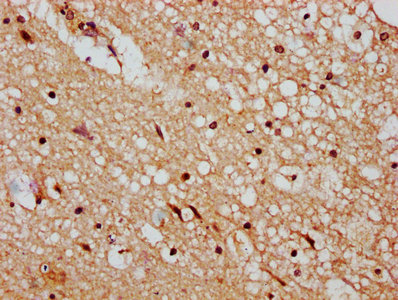 IHC image of CSB-PA873611LA01HU diluted at 1:400 and staining in paraffin-embedded human brain tissue performed on a Leica BondTM system. After dewaxing and hydration, antigen retrieval was mediated by high pressure in a citrate buffer (pH 6.0). Section was blocked with 10% normal goat serum 30min at RT. Then primary antibody (1% BSA) was incubated at 4°C overnight. The primary is detected by a biotinylated secondary antibody and visualized using an HRP conjugated SP system.