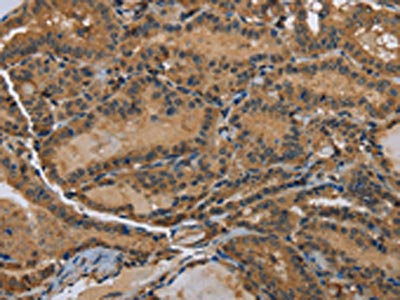 The image on the left is immunohistochemistry of paraffin-embedded Human thyroid cancer tissue using CSB-PA201270(DNAJA1 Antibody) at dilution 1/60, on the right is treated with fusion protein. (Original magnification: ×200)