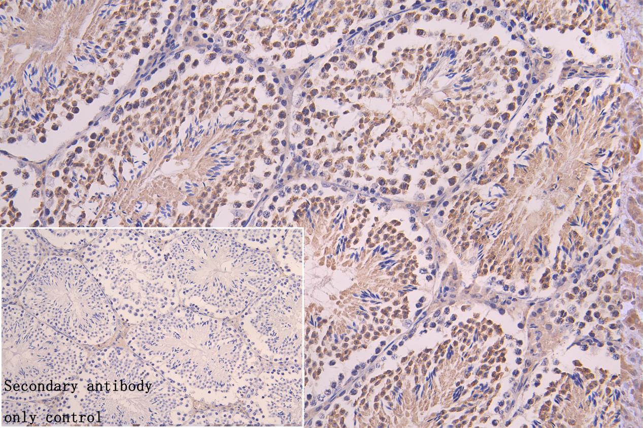 IHC image of CSB-PA007047LA01HU diluted at 1:200 and staining in paraffin-embedded mouse testis tissue performed on a Leica BondTM system. After dewaxing and hydration, antigen retrieval was mediated by high pressure in a citrate buffer (pH 6.0). Section was blocked with 10% normal goat serum 30min at RT. Then primary antibody (1% BSA) was incubated at 4°C overnight. The primary is detected by a Goat anti-rabbit polymer IgG labeled by HRP and visualized using 0.05% DAB. Secondary antibody only control: uses 1% BSA instead of primary antibody