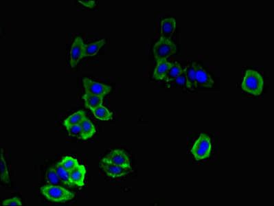 Immunofluorescent analysis of HepG2 cells using CSB-PA836266LA01HU at dilution of 1:100 and Alexa Fluor 488-congugated AffiniPure Goat Anti-Rabbit IgG(H+L)