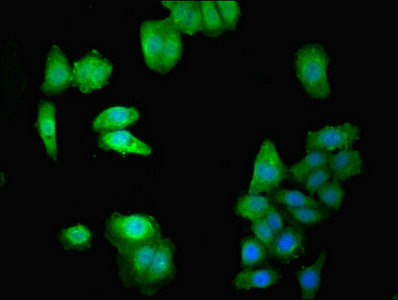 Immunofluorescent analysis of HepG2 cells using CSB-PA858723HA01HU at dilution of 1:100 and Alexa Fluor 488-congugated AffiniPure Goat Anti-Rabbit IgG(H+L)
