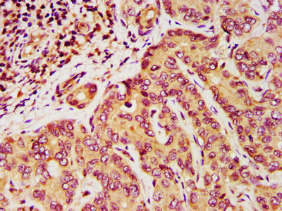 IHC image of CSB-PA007147LA01HU diluted at 1:200 and staining in paraffin-embedded human liver cancer performed on a Leica BondTM system. After dewaxing and hydration, antigen retrieval was mediated by high pressure in a citrate buffer (pH 6.0). Section was blocked with 10% normal goat serum 30min at RT. Then primary antibody (1% BSA) was incubated at 4°C overnight. The primary is detected by a biotinylated secondary antibody and visualized using an HRP conjugated SP system.