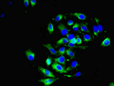 Immunofluorescent analysis of U87 cells using CSB-PA007182EA01HU at dilution of 1:100 and Alexa Fluor 488-congugated AffiniPure Goat Anti-Rabbit IgG(H+L)