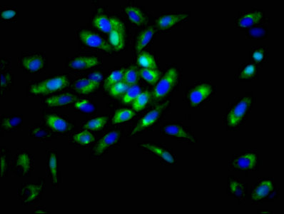 Immunofluorescence staining of Hela cells with CSB-PA007205LA01HU at 1:166, counter-stained with DAPI. The cells were fixed in 4% formaldehyde, permeabilized using 0.2% Triton X-100 and blocked in 10% normal Goat Serum. The cells were then incubated with the antibody overnight at 4°C. The secondary antibody was Alexa Fluor 488-congugated AffiniPure Goat Anti-Rabbit IgG(H+L).