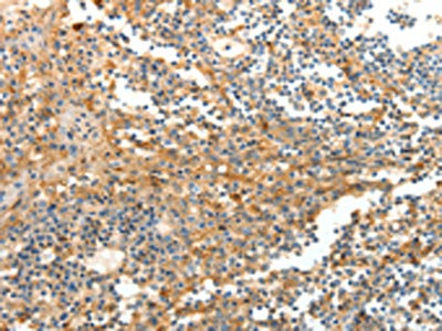 The image on the left is immunohistochemistry of paraffin-embedded Human tonsil tissue using CSB-PA026205(DTX3 Antibody) at dilution 1/20, on the right is treated with fusion protein. (Original magnification: ×200)