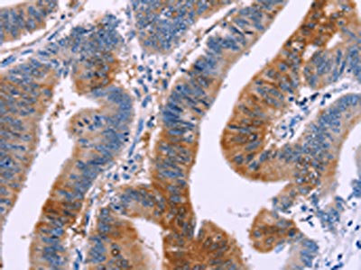 The image on the left is immunohistochemistry of paraffin-embedded Human colon cancer tissue using CSB-PA176280(DUSP13 Antibody) at dilution 1/50, on the right is treated with fusion protein. (Original magnification: ×200)