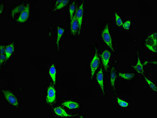 Immunofluorescent analysis of Hela cells using CSB-PA855469LA01HU at dilution of 1:100 and Alexa Fluor 488-congugated AffiniPure Goat Anti-Rabbit IgG(H+L)