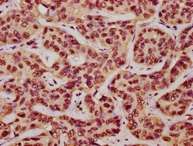 IHC image of CSB-PA007286ESR1HU diluted at 1:227 and staining in paraffin-embedded human liver cancer performed on a Leica BondTM system. After dewaxing and hydration, antigen retrieval was mediated by high pressure in a citrate buffer (pH 6.0). Section was blocked with 10% normal goat serum 30min at RT. Then primary antibody (1% BSA) was incubated at 4°C overnight. The primary is detected by a biotinylated secondary antibody and visualized using an HRP conjugated SP system.