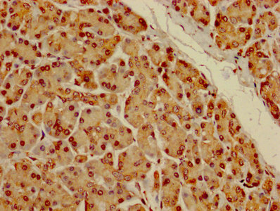 IHC image of CSB-PA007312LA01HU diluted at 1:100 and staining in paraffin-embedded human pancreatic tissue performed on a Leica BondTM system. After dewaxing and hydration, antigen retrieval was mediated by high pressure in a citrate buffer (pH 6.0). Section was blocked with 10% normal goat serum 30min at RT. Then primary antibody (1% BSA) was incubated at 4°C overnight. The primary is detected by a biotinylated secondary antibody and visualized using an HRP conjugated SP system.