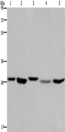 Gel: 8%SDS-PAGE, Lysate: 40 μg, Lane 1-5: 293T cells, MCF7 cells, PC3 cells, human fetal liver tissue, Hela cells, Primary antibody: CSB-PA568195(ECHS1 Antibody) at dilution 1/300, Secondary antibody: Goat anti rabbit IgG at 1/8000 dilution, Exposure time: 20 seconds