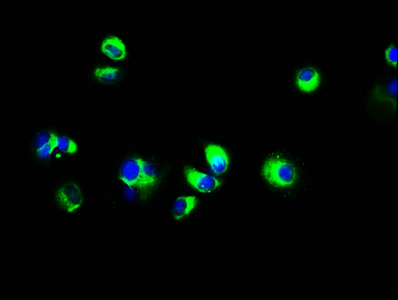 Immunofluorescence staining of A549 cells with CSB-PA007385LA01HU at 1:133, counter-stained with DAPI. The cells were fixed in 4% formaldehyde, permeabilized using 0.2% Triton X-100 and blocked in 10% normal Goat Serum. The cells were then incubated with the antibody overnight at 4°C. The secondary antibody was Alexa Fluor 488-congugated AffiniPure Goat Anti-Rabbit IgG(H+L).