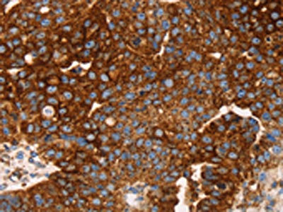 The image on the left is immunohistochemistry of paraffin-embedded Human breast cancer tissue using CSB-PA083210(EDAR Antibody) at dilution 1/45, on the right is treated with synthetic peptide. (Original magnification: ×200)