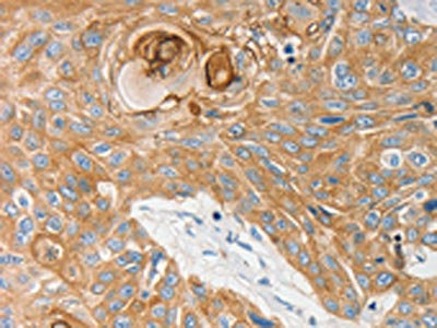 The image on the left is immunohistochemistry of paraffin-embedded Human esophagus cancer tissue using CSB-PA937611(EDNRB Antibody) at dilution 1/30, on the right is treated with synthetic peptide. (Original magnification: ×200)