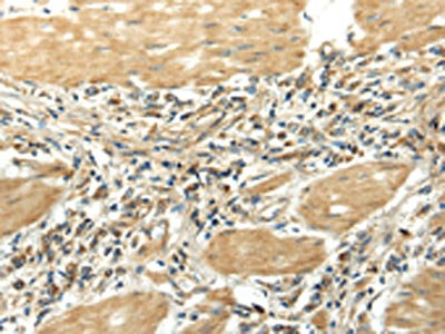 The image on the left is immunohistochemistry of paraffin-embedded Human gastric cancer tissue using CSB-PA561188(EFNA3 Antibody) at dilution 1/25, on the right is treated with fusion protein. (Original magnification: ×200)
