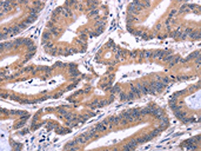 The image on the left is immunohistochemistry of paraffin-embedded Human colon cancer tissue using CSB-PA977329(EFNA5 Antibody) at dilution 1/40, on the right is treated with synthetic peptide. (Original magnification: ×200)