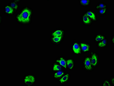 Immunofluorescence staining of HepG2 cells with CSB-PA005571LA01HU at 1:166, counter-stained with DAPI. The cells were fixed in 4% formaldehyde, permeabilized using 0.2% Triton X-100 and blocked in 10% normal Goat Serum. The cells were then incubated with the antibody overnight at 4°C. The secondary antibody was Alexa Fluor 488-congugated AffiniPure Goat Anti-Rabbit IgG(H+L).