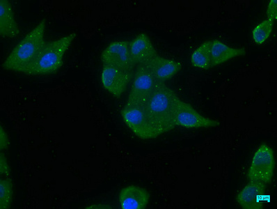 Immunofluorescence staining of Hela cells with CSB-PA007511LA01HU at 1:200, counter-stained with DAPI. The cells were fixed in 4% formaldehyde, permeabilized using 0.2% Triton X-100 and blocked in 10% normal Goat Serum. The cells were then incubated with the antibody overnight at 4°C. The secondary antibody was Alexa Fluor 488-congugated AffiniPure Goat Anti-Rabbit IgG(H+L).