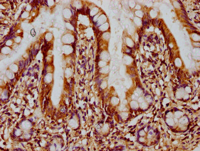 IHC image of CSB-PA007512LA01HU diluted at 1:300 and staining in paraffin-embedded human small intestine tissue performed on a Leica BondTM system. After dewaxing and hydration, antigen retrieval was mediated by high pressure in a citrate buffer (pH 6.0). Section was blocked with 10% normal goat serum 30min at RT. Then primary antibody (1% BSA) was incubated at 4°C overnight. The primary is detected by a biotinylated secondary antibody and visualized using an HRP conjugated SP system.