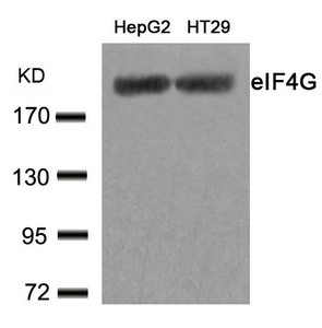 Western blot analysis of extracts from HepG2 and HT29 cells using eIF4G(Ab-1232) Antibody.