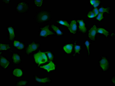 Immunofluorescence staining of MCF-7 cells with CSB-PA853408LA01HU at 1:200, counter-stained with DAPI. The cells were fixed in 4% formaldehyde, permeabilized using 0.2% Triton X-100 and blocked in 10% normal Goat Serum. The cells were then incubated with the antibody overnight at 4°C. The secondary antibody was Alexa Fluor 488-congugated AffiniPure Goat Anti-Rabbit IgG(H+L).