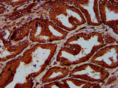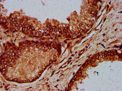 IHC image of CSB-PA853408LA01HU diluted at 1:600 and staining in paraffin-embedded human prostate tissue performed on a Leica BondTM system. After dewaxing and hydration, antigen retrieval was mediated by high pressure in a citrate buffer (pH 6.0). Section was blocked with 10% normal goat serum 30min at RT. Then primary antibody (1% BSA) was incubated at 4°C overnight. The primary is detected by a biotinylated secondary antibody and visualized using an HRP conjugated SP system.