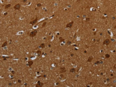 The image on the left is immunohistochemistry of paraffin-embedded Human brain tissue using CSB-PA235961(ENTPD7 Antibody) at dilution 1/40, on the right is treated with fusion protein. (Original magnification: ×200)