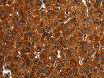 The image on the left is immunohistochemistry of paraffin-embedded Human liver cancer tissue using CSB-PA235961(ENTPD7 Antibody) at dilution 1/40, on the right is treated with fusion protein. (Original magnification: ×200)