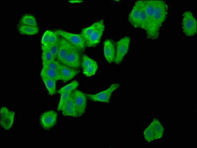 Immunofluorescence staining of HepG2 cells with CSB-PA020897LA01HU at 1:100, counter-stained with DAPI. The cells were fixed in 4% formaldehyde, permeabilized using 0.2% Triton X-100 and blocked in 10% normal Goat Serum. The cells were then incubated with the antibody overnight at 4°C. The secondary antibody was Alexa Fluor 488-congugated AffiniPure Goat Anti-Rabbit IgG(H+L).