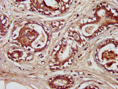 IHC image of CSB-PA020897LA01HU diluted at 1:300 and staining in paraffin-embedded human breast cancer performed on a Leica BondTM system. After dewaxing and hydration, antigen retrieval was mediated by high pressure in a citrate buffer (pH 6.0). Section was blocked with 10% normal goat serum 30min at RT. Then primary antibody (1% BSA) was incubated at 4°C overnight. The primary is detected by a biotinylated secondary antibody and visualized using an HRP conjugated SP system.