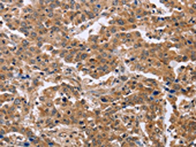 The image on the left is immunohistochemistry of paraffin-embedded Human liver cancer tissue using CSB-PA010637(EPDR1 Antibody) at dilution 1/40, on the right is treated with fusion protein. (Original magnification: ×200)