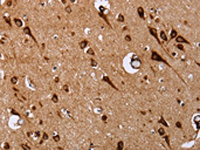 The image on the left is immunohistochemistry of paraffin-embedded Human brain tissue using CSB-PA283664(EPDR1 Antibody) at dilution 1/20, on the right is treated with fusion protein. (Original magnification: ×200)